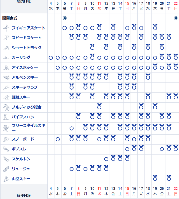 競技は2月4日から始まり、閉会式が行われる2月22日まで、8競技116種目が行われます。