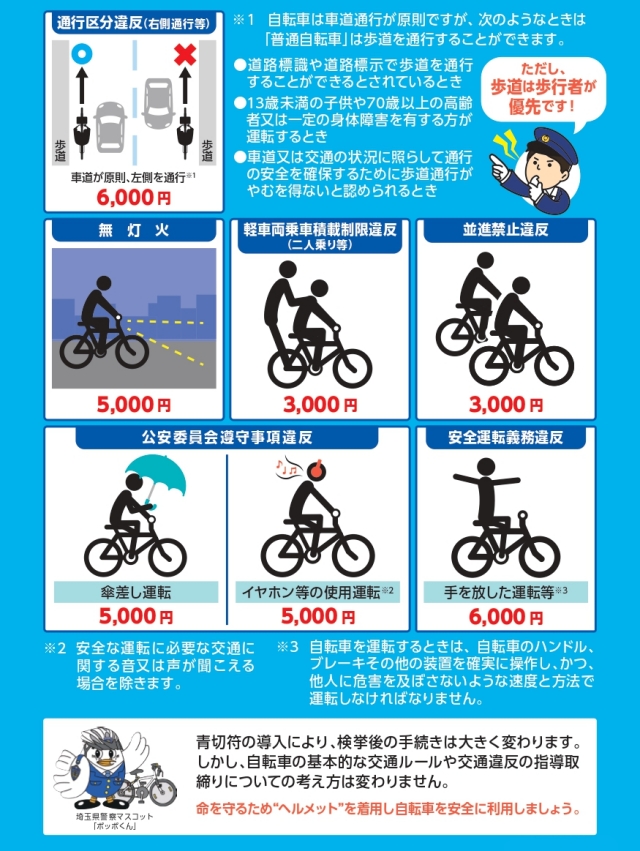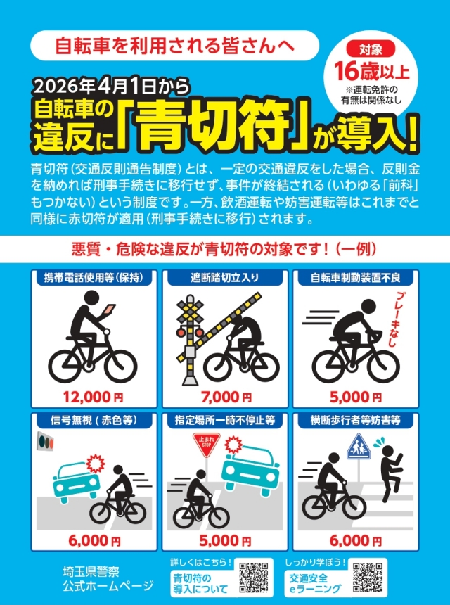「青切符」制度は、16歳以上を対象に、自転車の交通違反に対し反則金の納付を通告する。