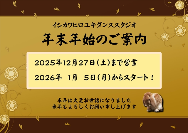 石川です。 営業案内です。 2026年は1月5日(月)12:00~からになります。 よろしくお願いいたします。 それでは、また。。。