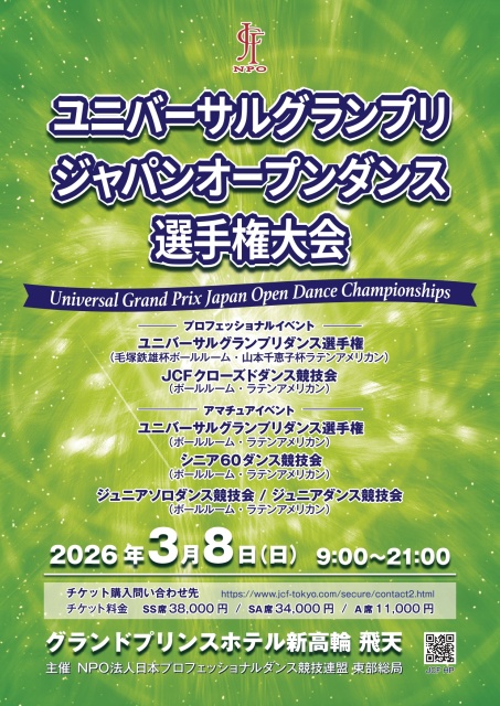 石川です。 「2026ユニバーサルグランプリジャパンオープンダンス選手権大会」のお知らせです。 日時:2026年 3月8日(日) 9:00~21:00会場:グランドプリンスホテル新高輪 飛天主催:日本プロフェッショナルダンス競技連盟 東部総局 <プロフェッショナル部門>・毛塚鉄雄杯ユニバーサルグランプリ ボールルームダンス選手権・山本千恵子杯ユニバーサルグランプリ ラテンダンス選手権 ・JCF ク […]