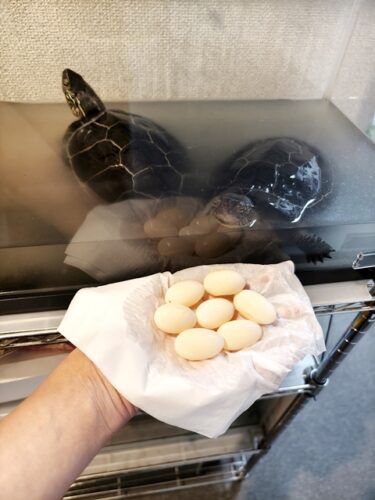 カメの甲羅の中にタマゴがいっぱい入ってりゃ食べられないモンね。